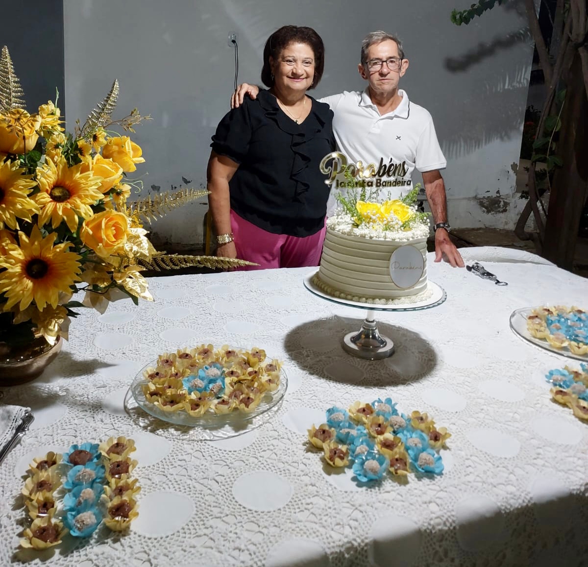 A professora e empresária Jacinta Bandeira renovou sua idade. No registro, ao lado do esposo, Sr. Bandeira. O casal reuniu familiares e amigos para festejar o novo ciclo.