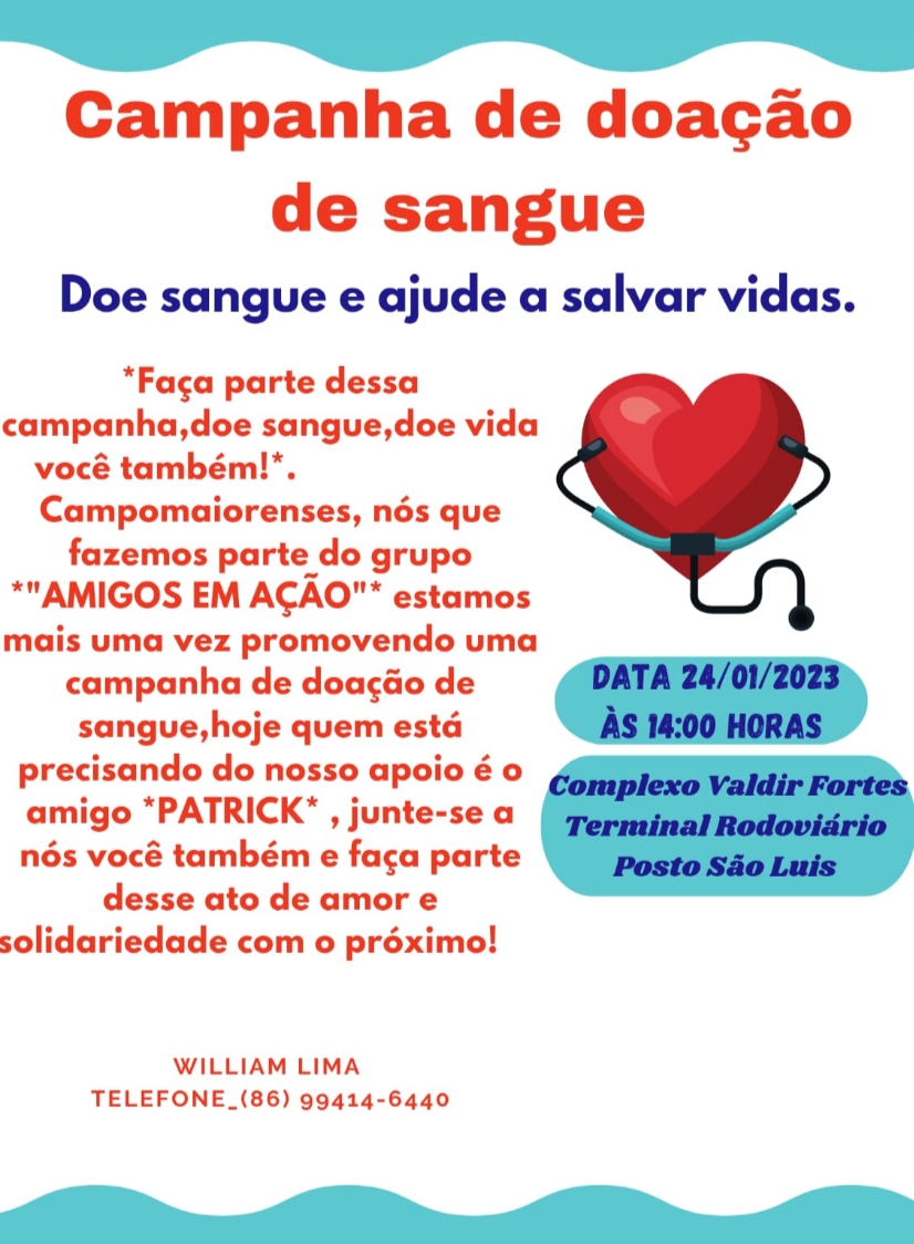 “Uma van vai passar às 14h da próxima terça-feira no Completo Valdir Fortes, Rodoviária e Posto São Luís pegando o pessoal para doar sangue para o Patrick em Teresina. Convidamos todos os campmaiorenses a participarem e ajudar nosso irmão Patrick”, disse ao DIÁRIO William Lima, coordenador do Amigos em Ação.