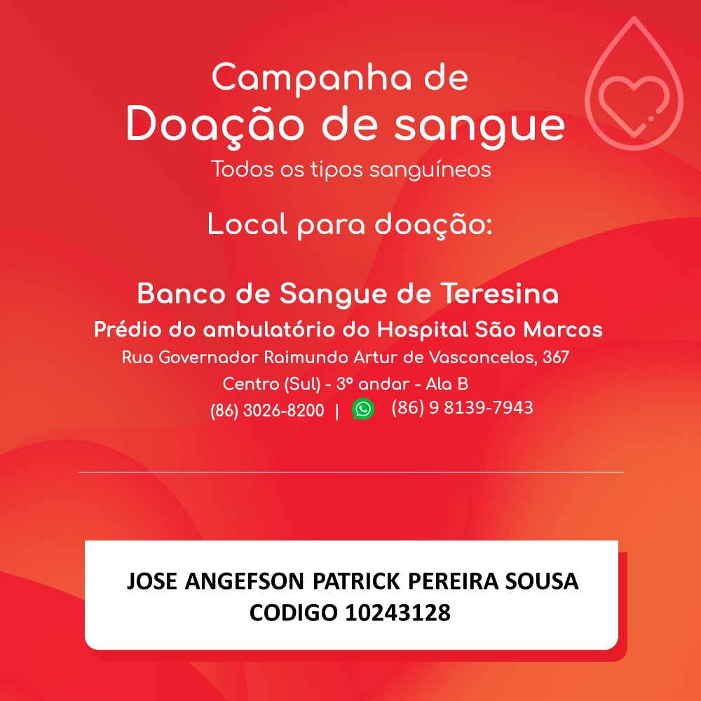 A doação de sangue pode ser realizada ainda de forma individual no prédio do ambulatório do Hospital São Marcos, em Teresina. O código do campomaiorense é o 10243128. Angerfson Patrick é filho da comerciante Socorro do Gás e tem o quadro de saúde considerado delicado pela equipe médica.