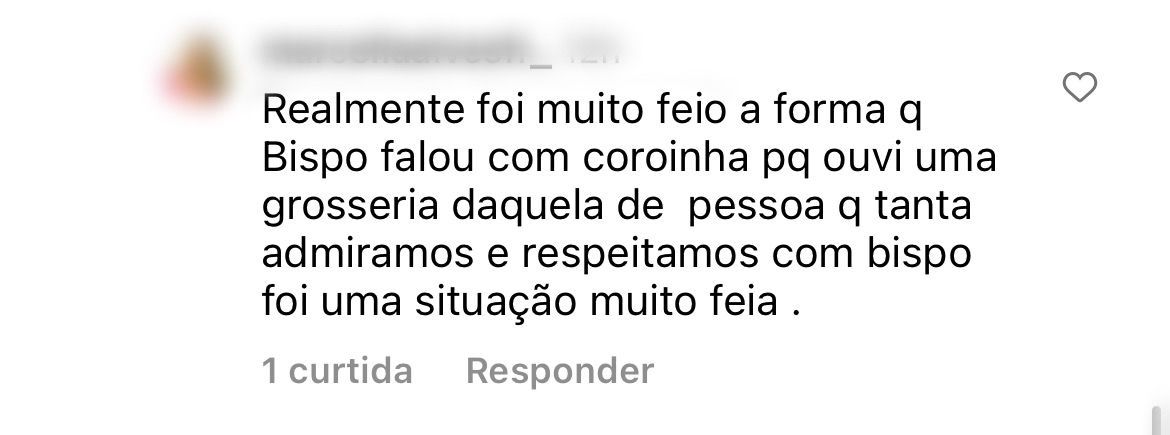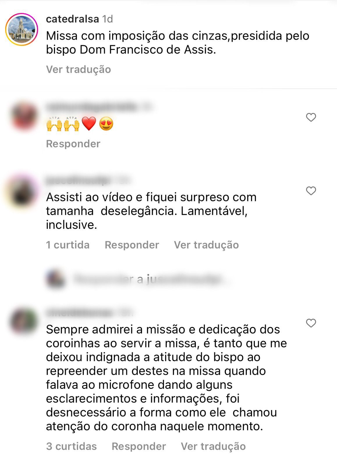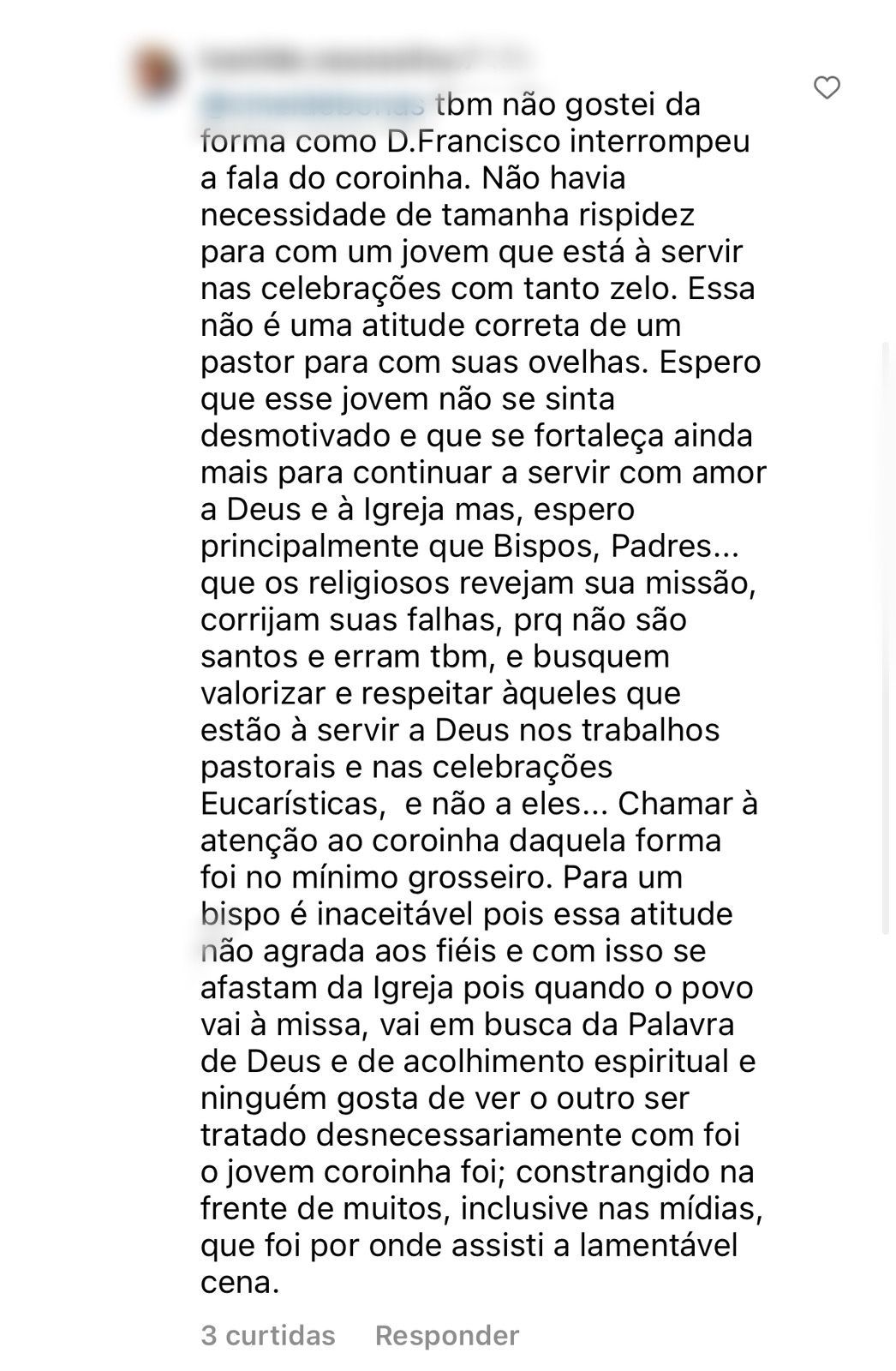 Nas redes, fiéis se manifestaram contrários a Dom Francisco. “Sempre admirei a missão e dedicação dos coroinhas ao servir a missa, é tanto que me deixou indignada a atitude do bispo ao repreender um destes na missa quando falava ao microfone dando alguns esclarecimentos e informações, foi desnecessário a forma como ele chamou atenção do coronha naquele momento”, escreveu uma fiel.