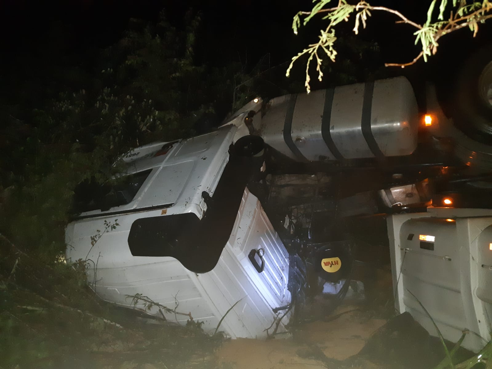 De acordo com a Polícia Rodoviária Federal (PRF), o acidente aconteceu devido uma colisão lateral entre os dois veículos na rodovia. Na batida, a carreta saiu da pista e tombou no acostamento. Já o carro menor ficou parcialmente destruído.