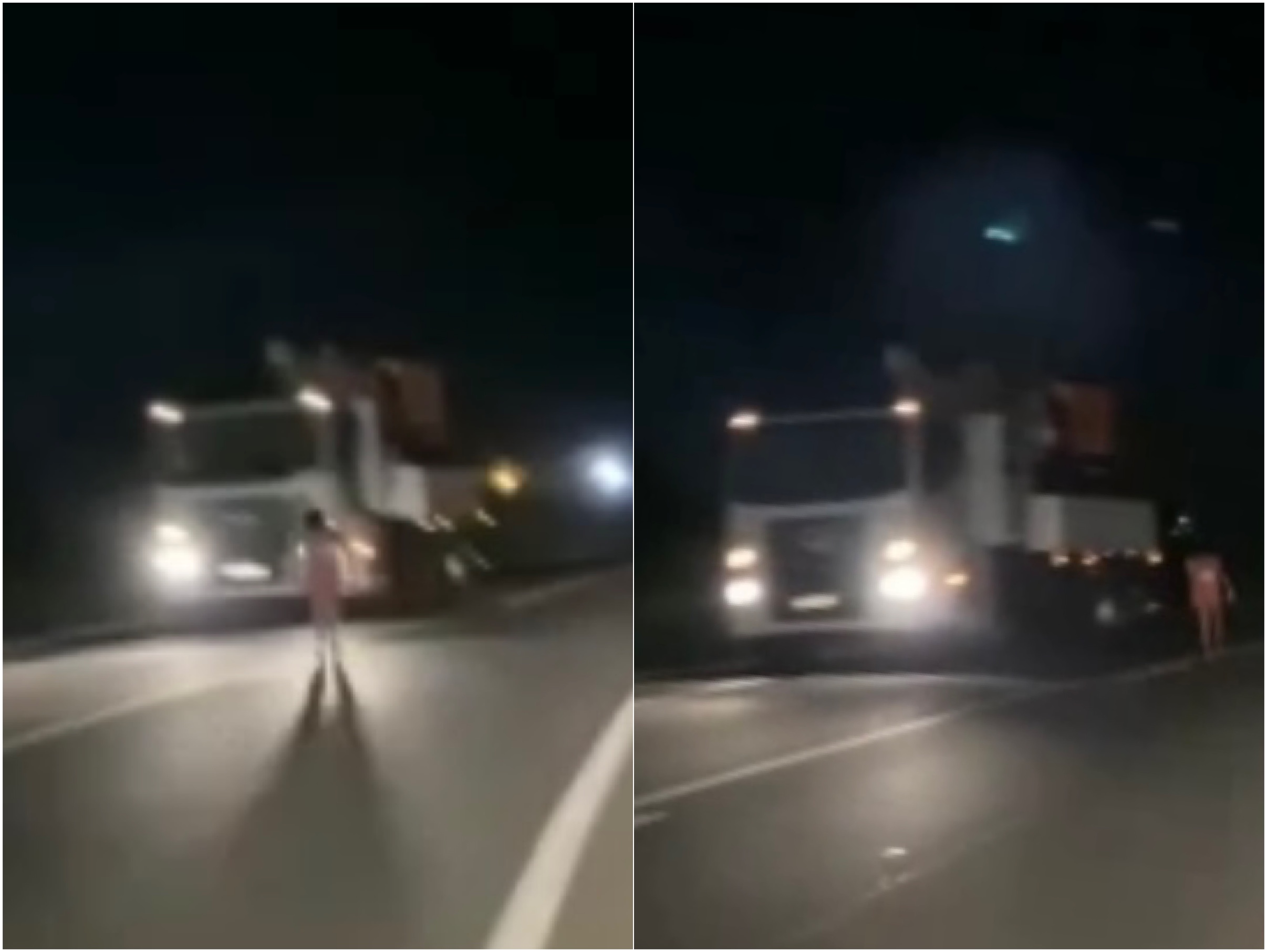 Um vídeo gravado por um motorista na noite dessa quarta-feira (2) registrou o momento exato que uma mulher desnorteada quase é atropelada por um caminhão na BR 343, em Campo Maior. O flagrante foi realizado em uma curva da rodovia.