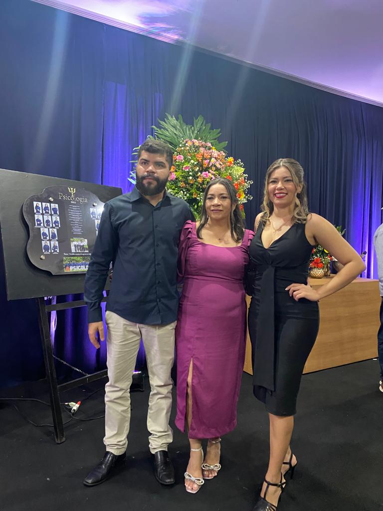 A psicopedagoga e psicóloga Cleudia Silva ladeada pelos filhos Érica Lene e Antônio Rodrigues em momento especial.