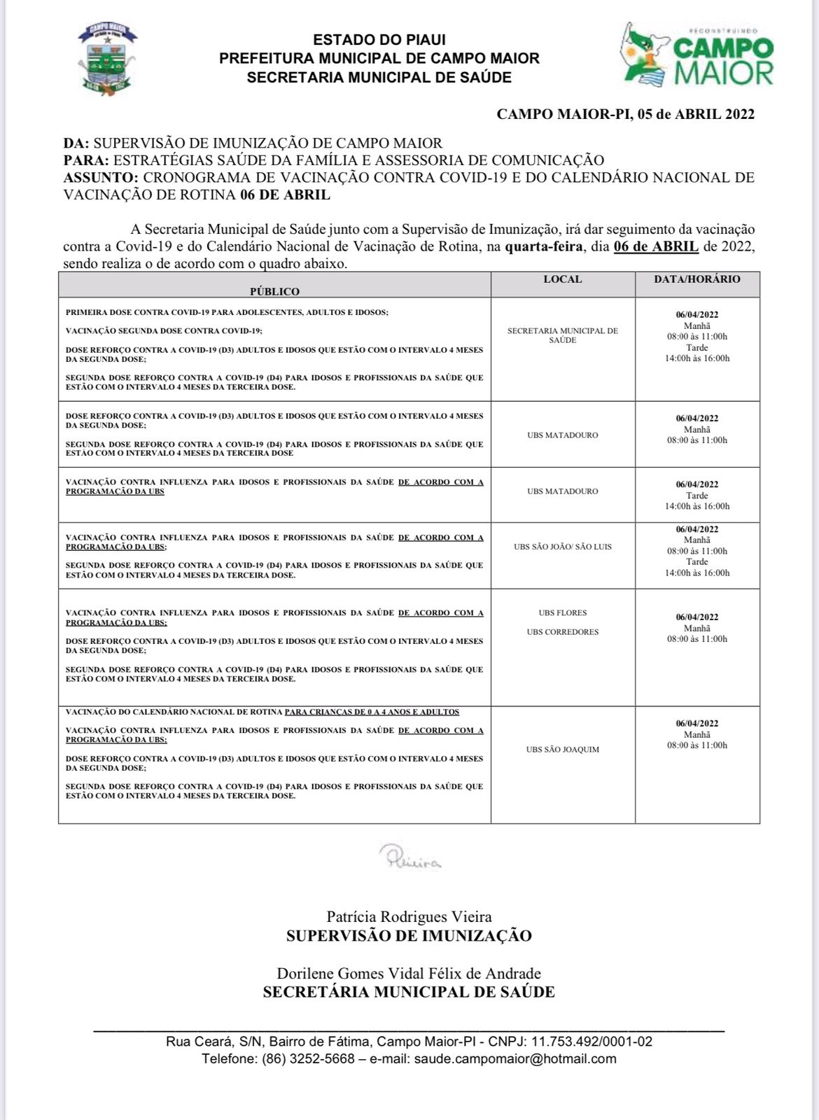 A Prefeitura de Campo Maior, por meio da Secretaria de Saúde, iniciou nesta segunda-feira (04/04) a Campanha Nacional de Vacinação Contra a Influenza. Nesta primeira etapa, estão sendo contemplados com vacinação idosos e profissionais da Saúde. Outros grupos também serão convocados em breve.