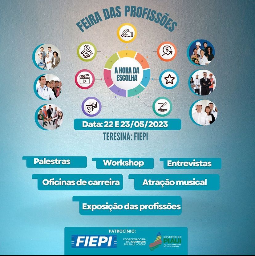 Acontece na sede da Federação das Indústrias do Estado do Piauí (FIEPI), em Teresina, nos dias 22 e 23 de maio, a Feira das Profissões. O evento é destinado aos vestibulandos e interessados em conhecer um pouco mais sobre cada profissão.