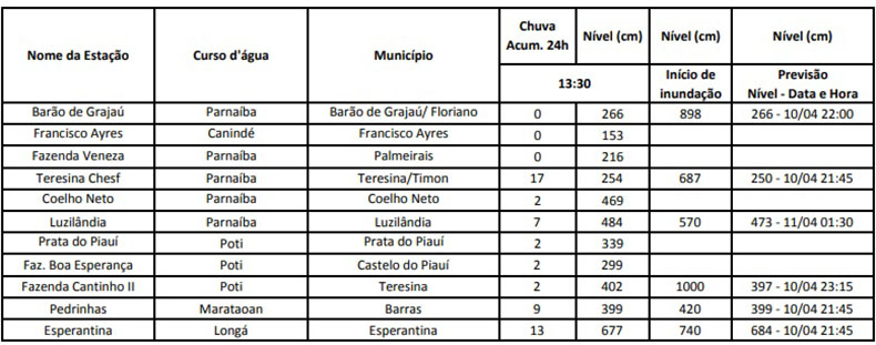 Os rios dos municípios de Barras e Esperantina, na região Norte do Piauí, seguem em cota de alerta, segundo o boletim do Serviço Geológico do Brasil (CPRM), divulgado na tarde desse domingo (10).