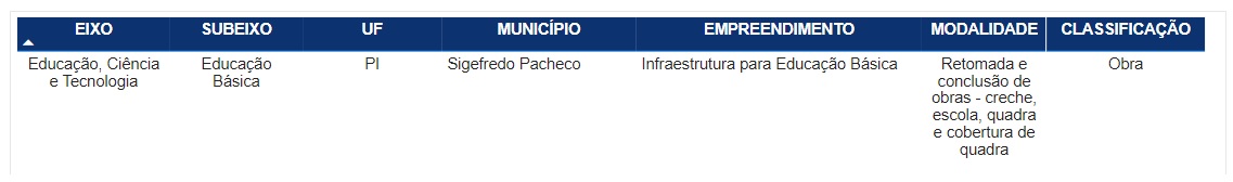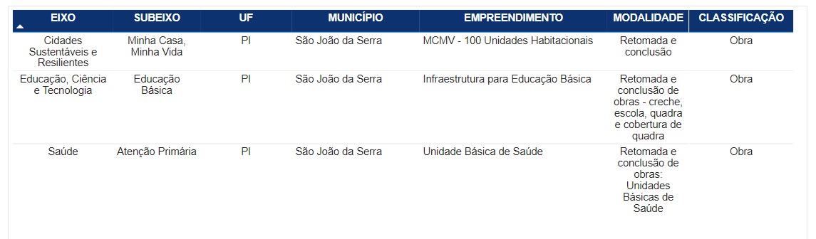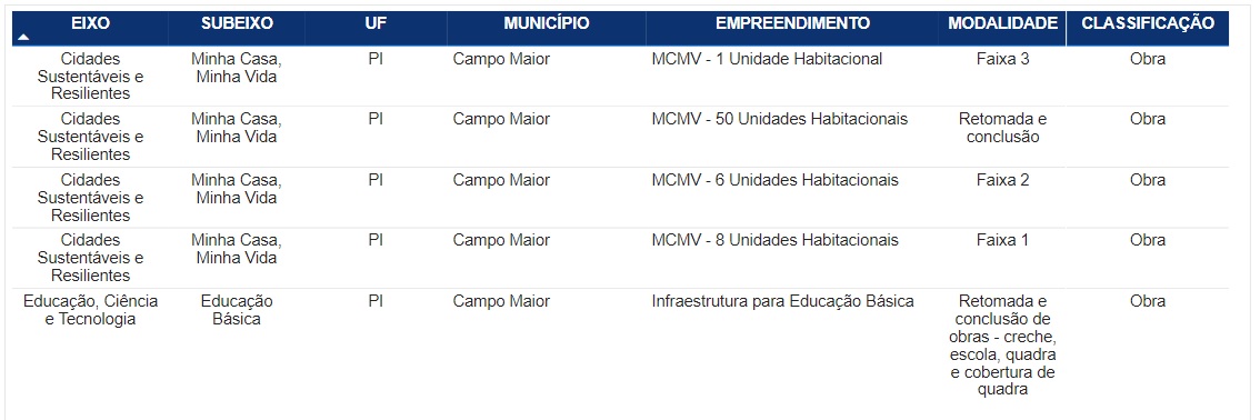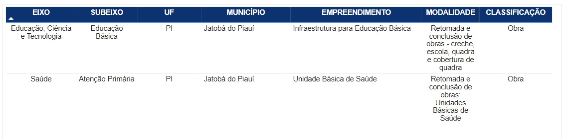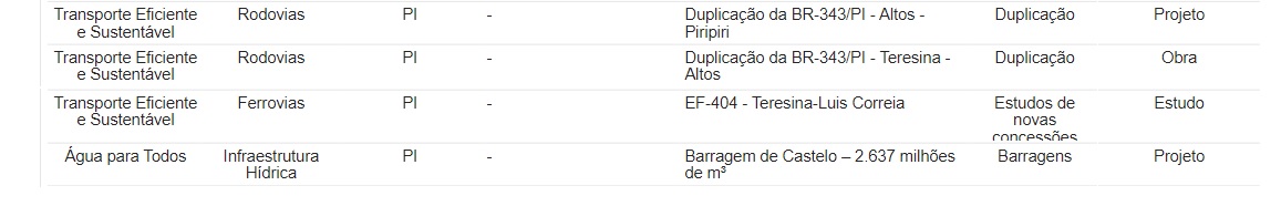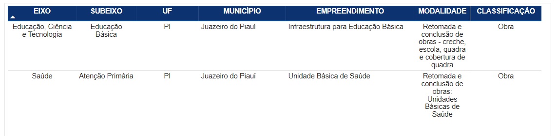 O governo selecionou obras em Campo Maior, Jatobá do Piauí, Boqueirão, Sigefredo Pacheco, Juazeiro, São João da Serras.