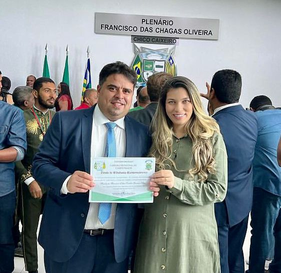 O secretário de Desenvolvimento Rural de Campo Maior, Humberto Filho, ao lado da esposa, Jardane Carvalho, durante entrega do título de Cidadão Campomaiorense na Câmara Municipal.