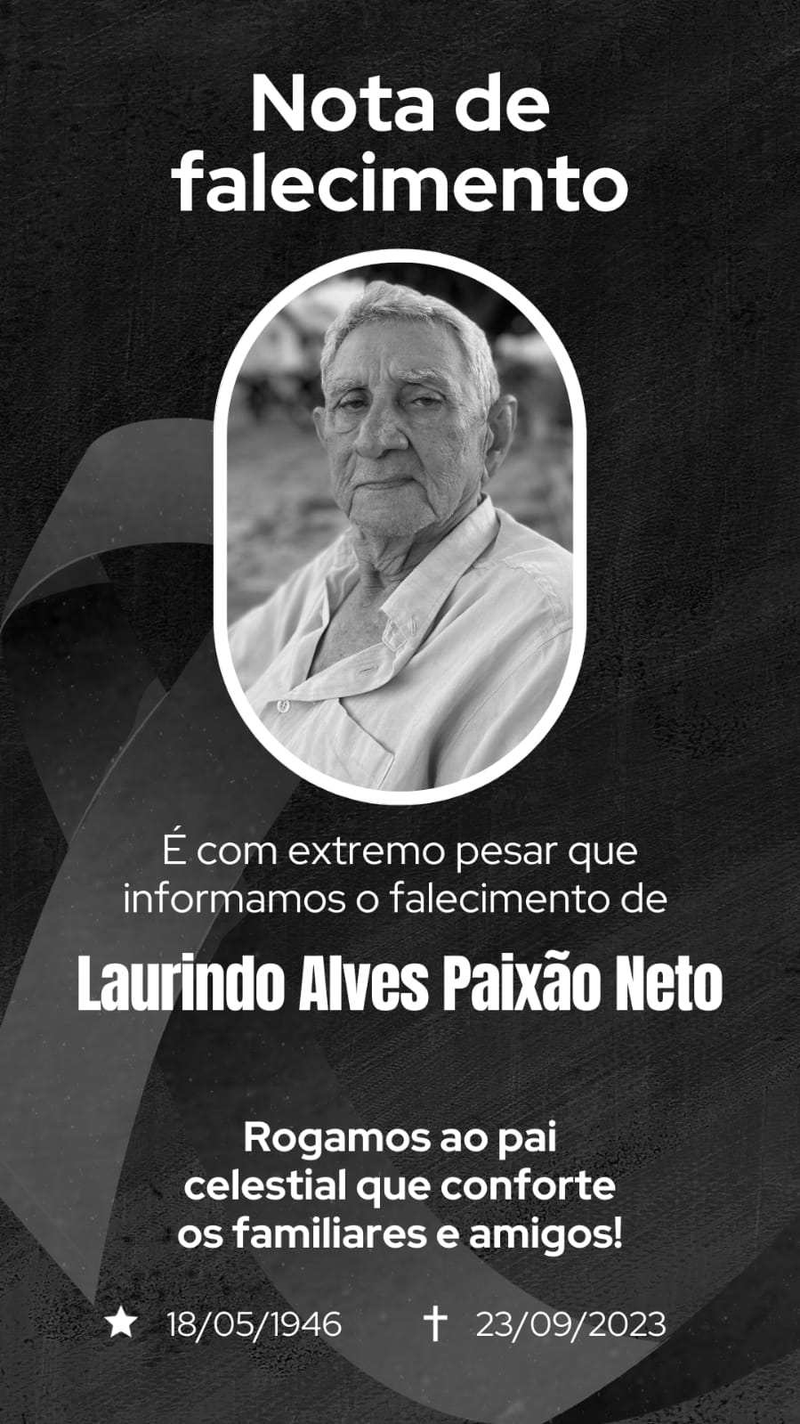 Laurindo Paixão, 77 anos, sofreu um aneurisma e foi submetido a uma cirurgia de urgência no último domingo (17). O idoso teve complicações do procedimento cirúrgico e teve o quadro de saúde agravado. Neste sábado, ele não resistiu e faleceu.