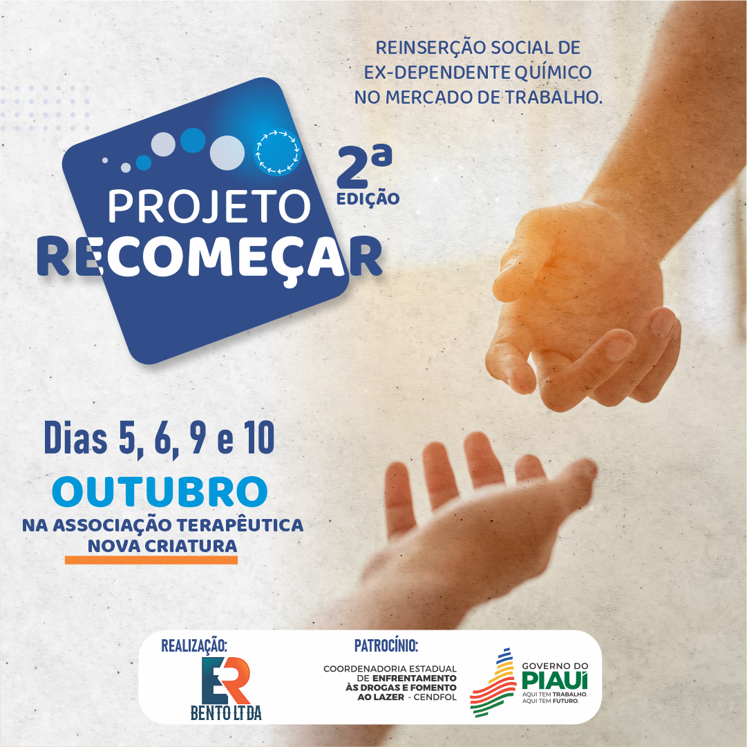O Projeto "Recomeçar" com sua 2o edição, em parceria com a Coordenadoria de Enfrentamento às Drogas e Fomento ao Lazer (CENDFOL) e o Governo do Estado do Piauí, está marcado para acontecer nos dias 05, 06, 09 e 10 de outubro de 2023, na associação Nova Criatura em Teresina-PI.