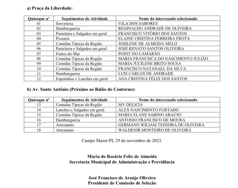 A Prefeitura de Campo Maior divulgou nesta quarta-feira (29) a lista das pessoas contempladas para explorar os quiosques da Praça da Liberdade e da Avenida Santo Antônio, na rotatória do Hospital.