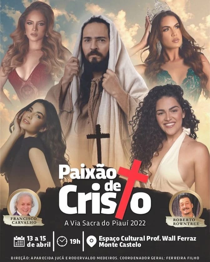 “Retornando após uma pausa por conta das restrições provocadas devido a pandemia do coronavírus, a tradicional Via Sacra do Bairro Monte Castelo (...) vem com várias novidades, inclusive com a participação de vários convidados locais e nacionais (...) participarão da encenação os atores Francisco Carvalho (João Batista), Roberto Rowntree (Pilatos), Pilar Costa (Maria Cleofas), além das misses Cecília Almeida (Demônio) Emylle Costa (Cláudia) Gaby Lacerda (Salomé)”, diz a publicação.