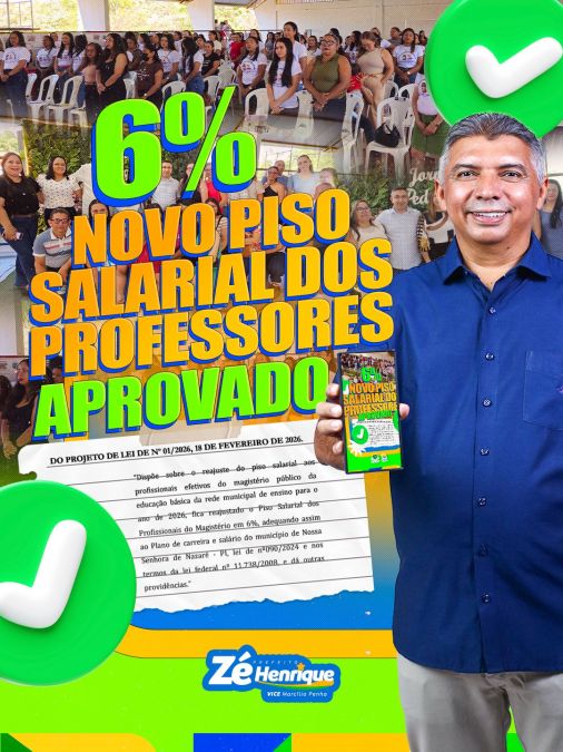 Os professores do município de Nossa Senhora de Nazaré terão uma reajuste no piso salarial de 6%, conforme anunciou o prefeito Zé Henrique nesta sexta-feira (20).