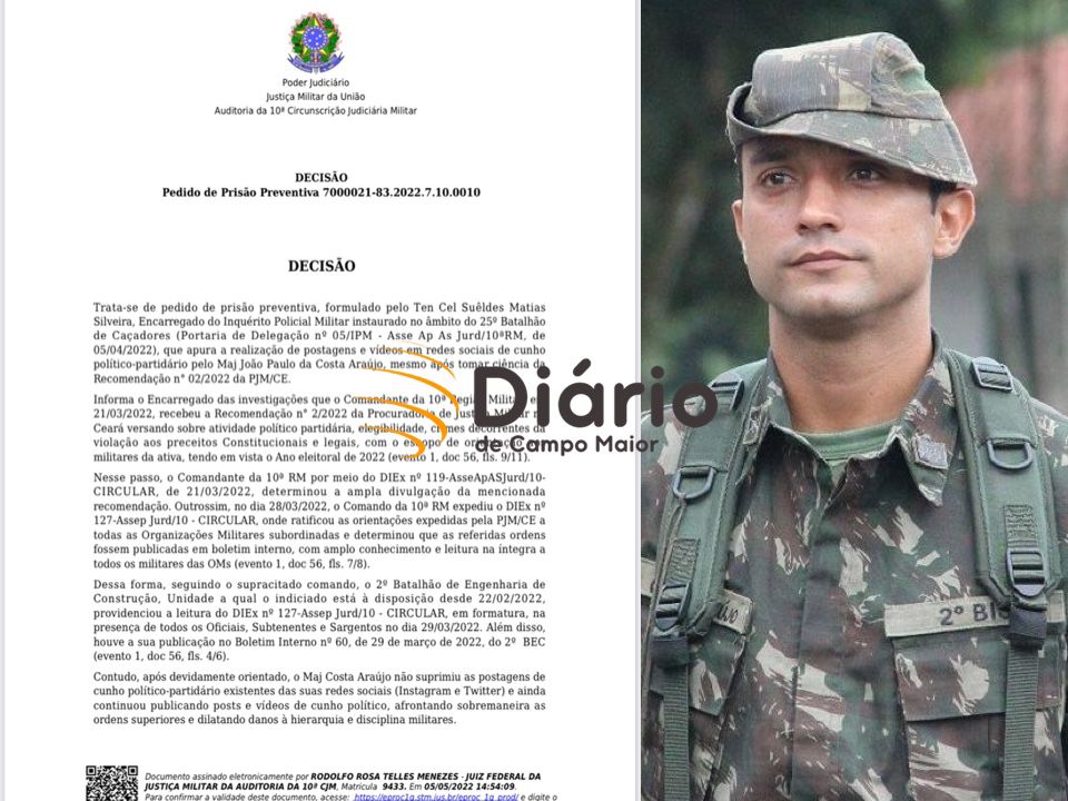 O Diário de Campo Maior obteve com EXCLUSIVIDADE a íntegra da decisão que determinou a prisão preventiva do Major campomaiorense João Paulo da Costa Araújo Alves, do 25º Batalhão de Caçadores do Exército Brasileiro. A decisão é assinada pelo Juiz Federal da Justiça Militar Rodolfo Rosa Telles Menezes e com data de 5 de maio.