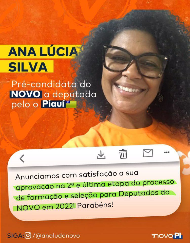 A campomaiorense Ana Lúcia Silva é pré-candidata a deputada estadual pelo Novo. Ela confirmou à coluna a pré-candidatura depois que foi aprovada na 2ª e última fase do processo de formação e seleção de candidatos do partido, que é uma metodologia aplicada pelo Novo em todo o país.
