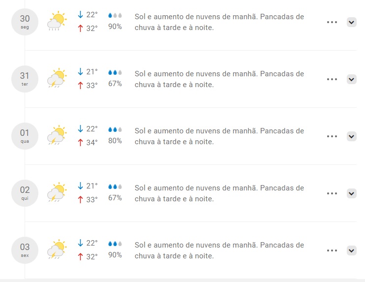 Na quarta a possibilidade de chuva é ainda maior, segundo a meteorologia. Com 80% de chance, a precipitação deve cair à tarde e à noite. Essa média de chuva deve seguir até o domingo (05/06).