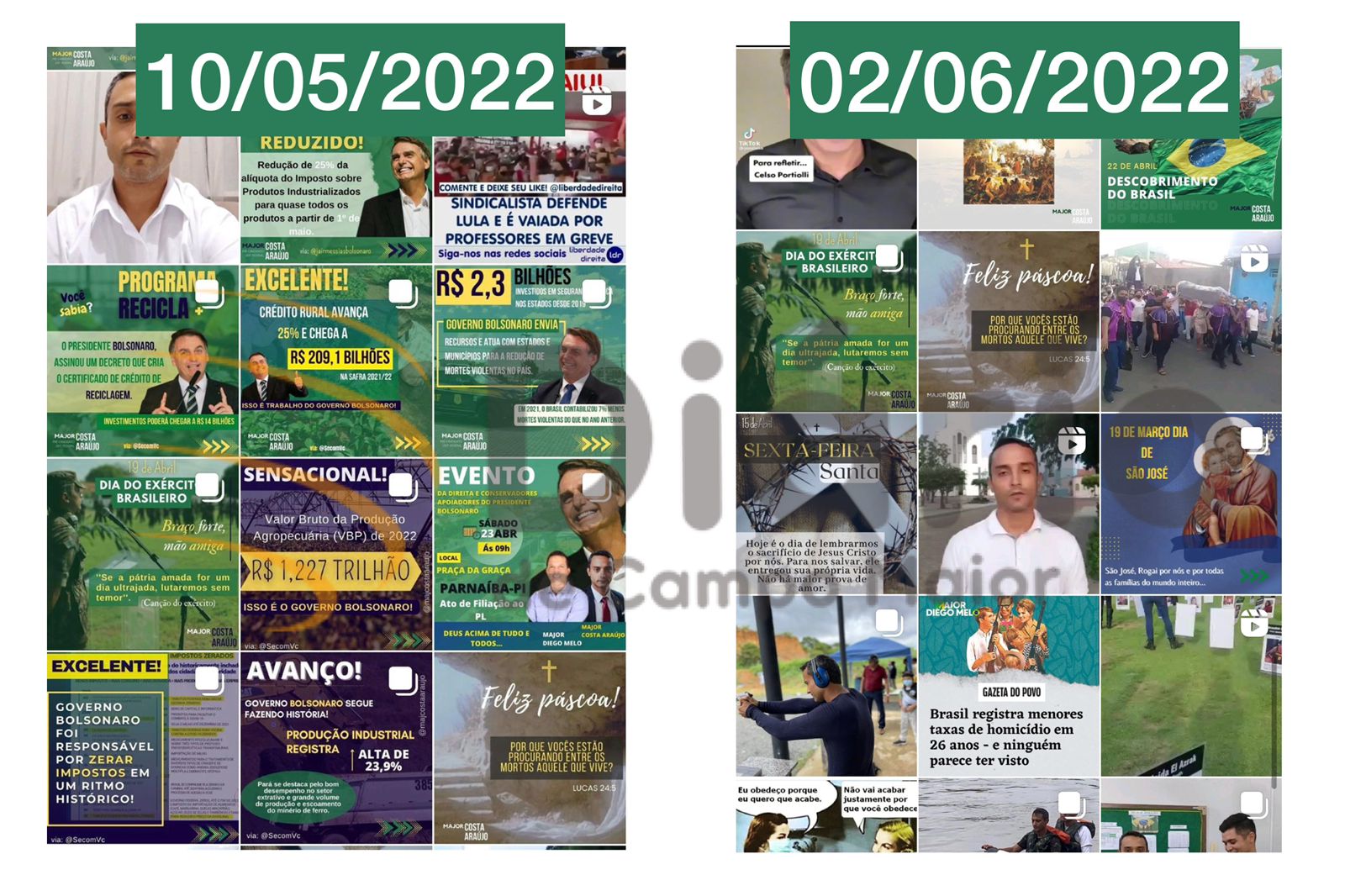 Em um comparativo feito pelo Diário de Campo Maior, é possível perceber que todas as publicações pró-bolsonaro já não estavam mais presentes no feed do seu Instagram.