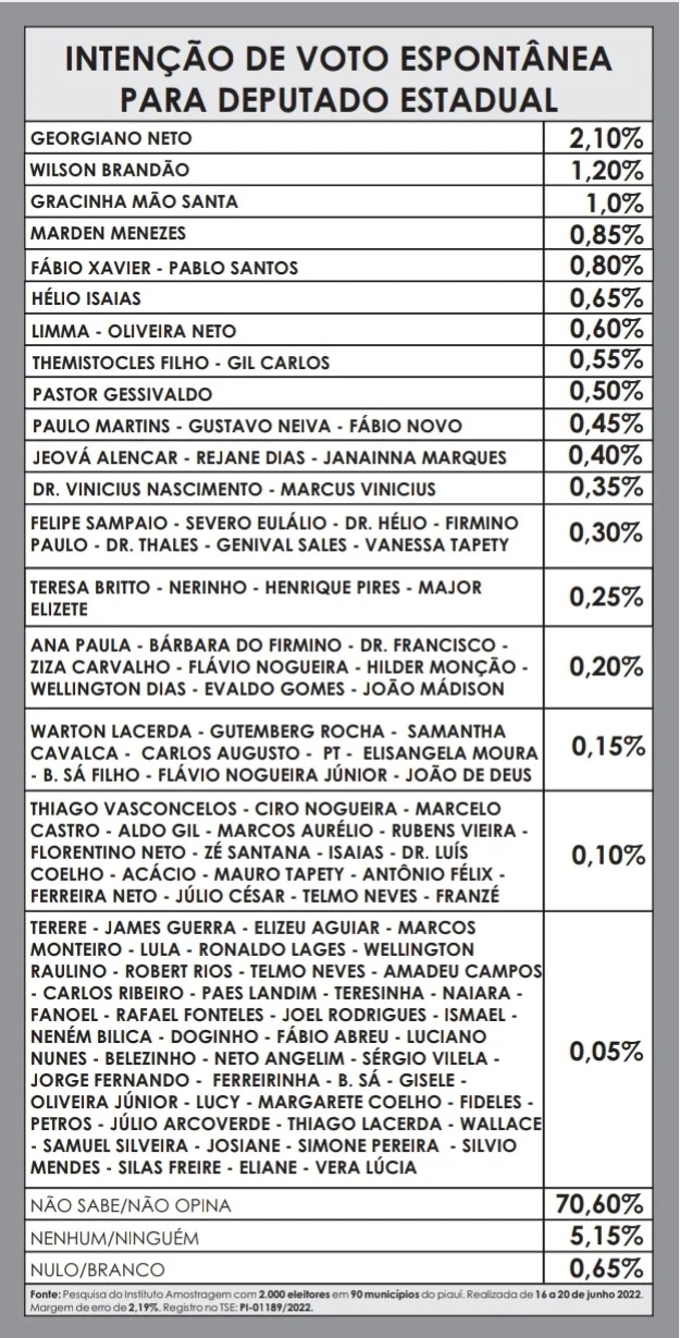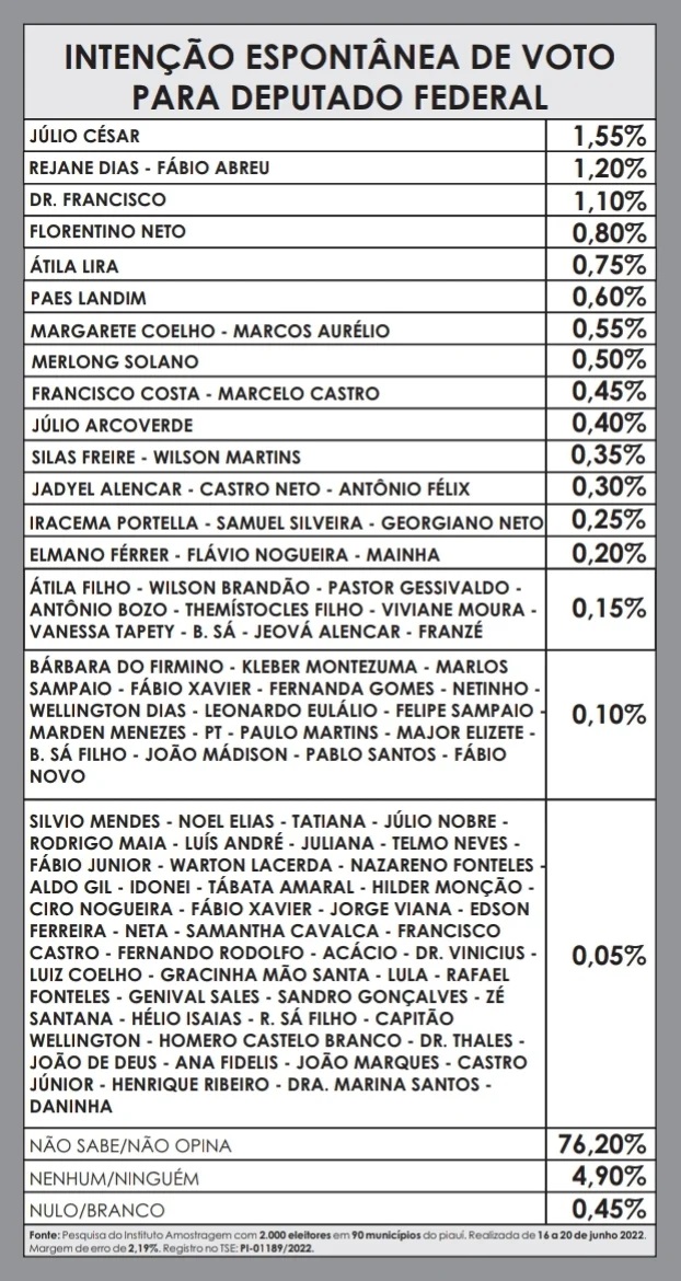 O levantamento foi realizado de 16 e 20 de junho. A amostra tem nível de confiança de 95% e permite margem de erro de até 2,19%. O registro para os cargos de governador, senador, deputado federal e deputado estadual é PI-01189/2022.