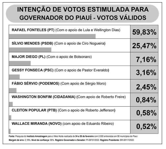 Já no cenário em outro cenário estimulado, quando o instituto apontou Rafael com apoio de Lula e Wellington Dias e Sílvio Mendes com apoio de Ciro Nogueira, Rafael apareceu com 59,83% das intenções e Sílvio Mendes com 25,47%.
