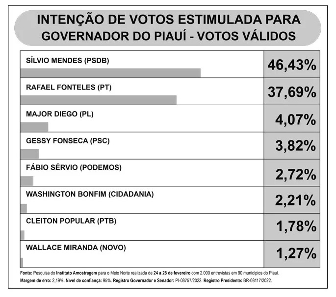 Uma pesquisa realizada pelo Instituto Amostragem e divulgada pelo sistema Meio Norte de Comunicação aponta que o ex-prefeito de Teresina Sílvio Mendes (PSDB) liderada a corrida eleitoral para o governo do Estado, enquanto o pré-candidato Rafael Fonteles (PT) ocupa a segunda posição.