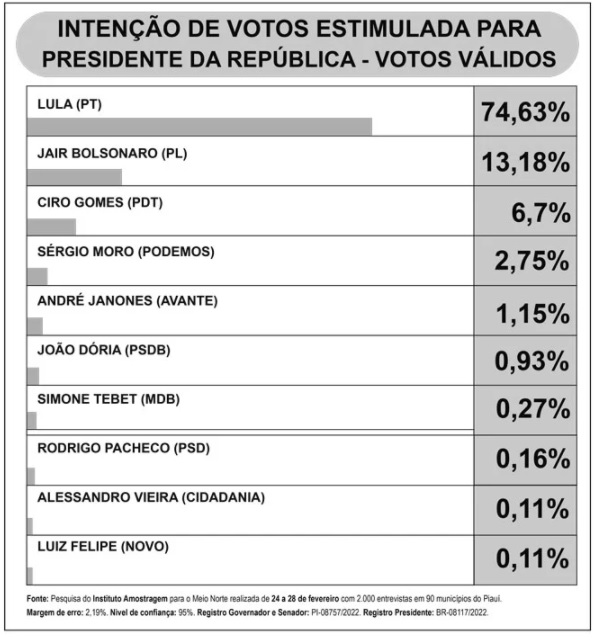 A pesquisa do Instituto Amostragem para o Meio Norte foi realizada de 24 a 28 de fevereiro com 2.000 entrevistas em 90 municípios do Piauí. A margem de erro é de 2,19 pontos percentuais para mais ou para menos. O nível de confiança é de 95%. A pesquisa para os cargos de governador e senador está registrada sob o número PI-08757/2022. E a pesquisa para o cargo de presidente tem registro BR-08117/2022.