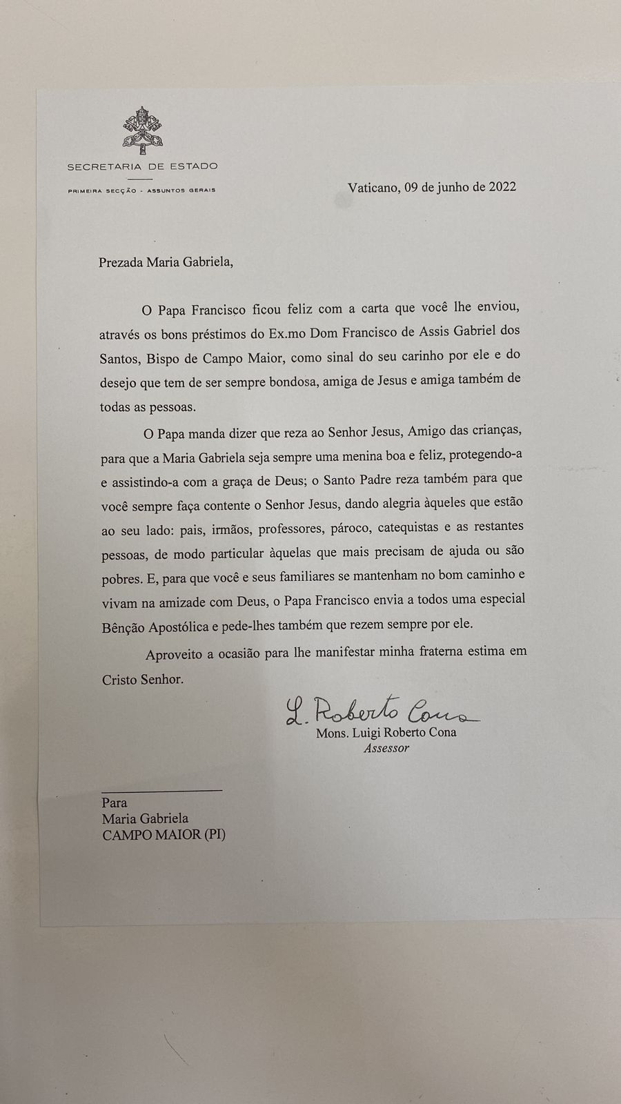 O Papa Francisco enviou uma carta a uma criança de Campo Maior identificada como Maria Gabriela, 9 anos. A correspondência datada de 9 de julho de 2022 foi entregue nesta sexta-feira (15/07) pelo bispo de Campo Maior, Dom Francisco de Assis. A carta é uma resposta a uma mensagem enviada pela criança ao Papa.