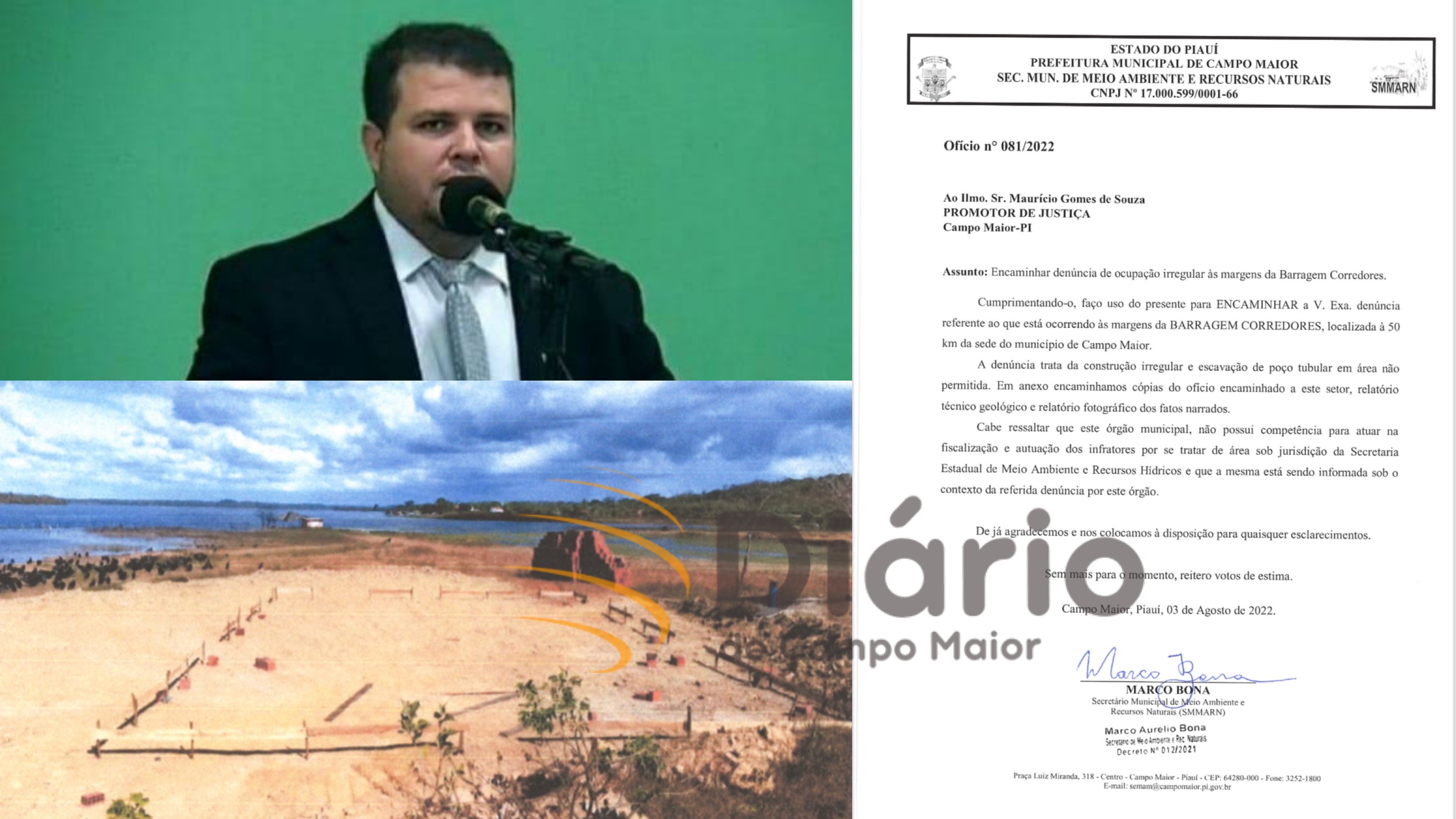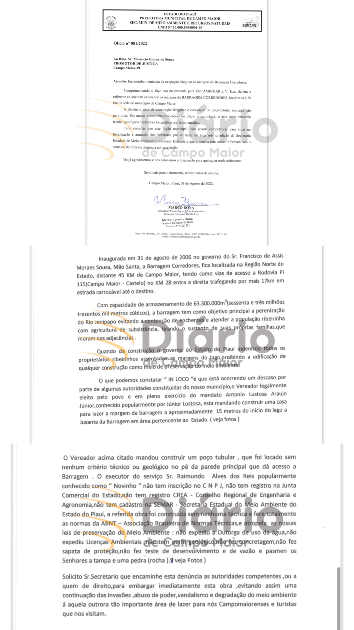 "O que podemos constatar 'IN LOCO' é que está ocorrendo um descaso por parte de algumas autoridades constituídas do nosso município,o Vereador legalmente eleito pelo povo e em pleno exercício do mandato Antonio Lustosa Araujo Júnior,conhecido popularmente por Júnior Lustosa, esta mandando construir uma casa para lazer a margem da barragem a aproximadamente 15 metros do início do lago a Jusante da Barragem em área pertencente ao Estado", diz o documento, que é assinado por Marco Bona, Secretário de Meio Ambiente e Recursos Hídricos do município.
