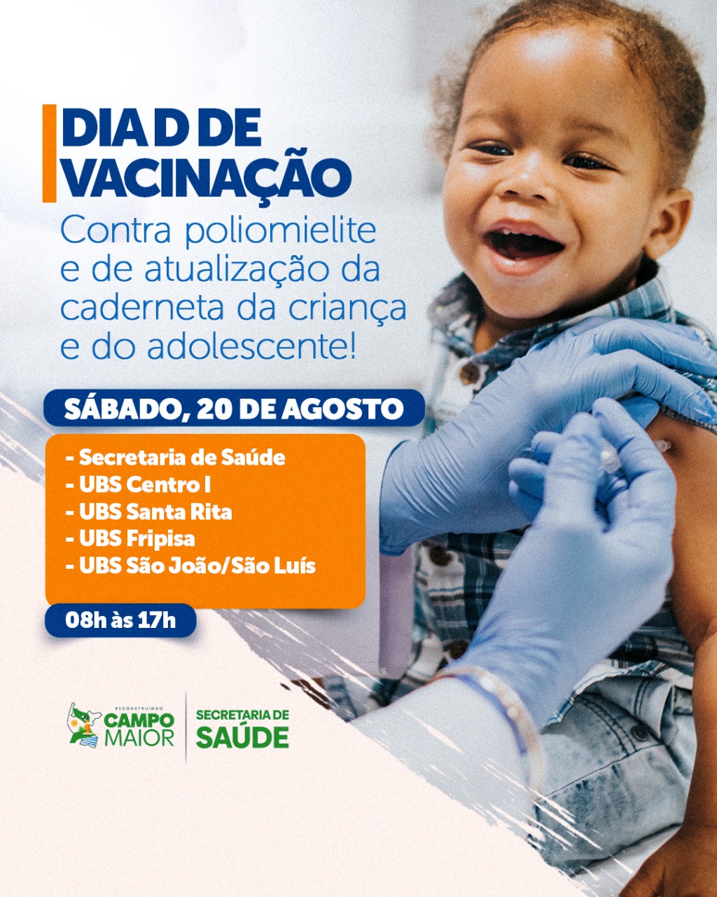 No próximo sábado (20), em Campo Maior, vai acontecer o dia “D” da Campanha Nacional de Vacinação contra a Poliomielite e Multivacinação. A data tem como objetivo ampliar a cobertura vacinal de crianças e adolescentes contra a Poliomielite. Crianças de um a quatro anos poderão ser vacinadas.