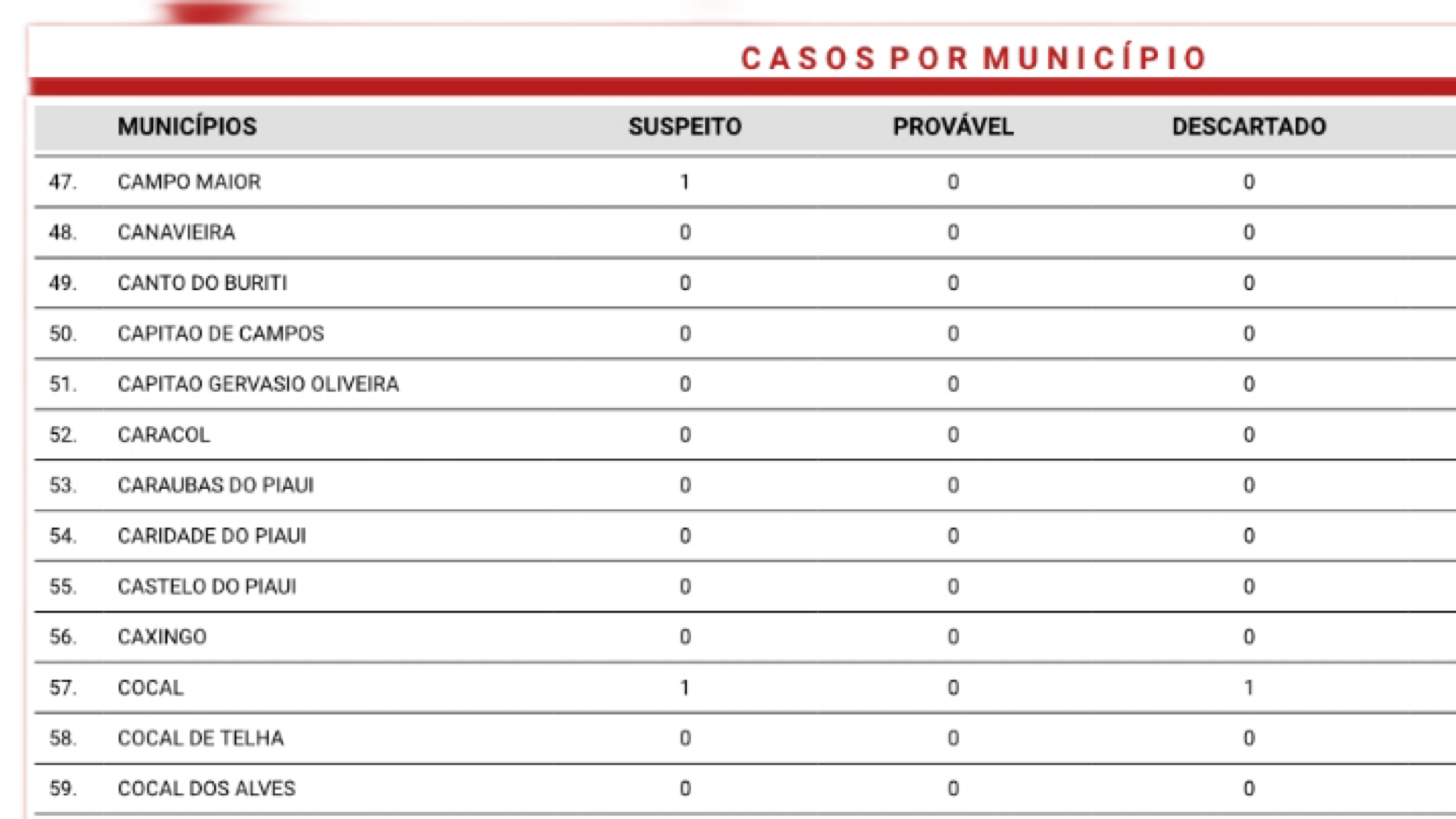 O Piauí atualmente conta com 58 casos suspeitos, 2 prováveis, 18 descartados, 4 confirmados, 82 notificados e 0 óbitos.