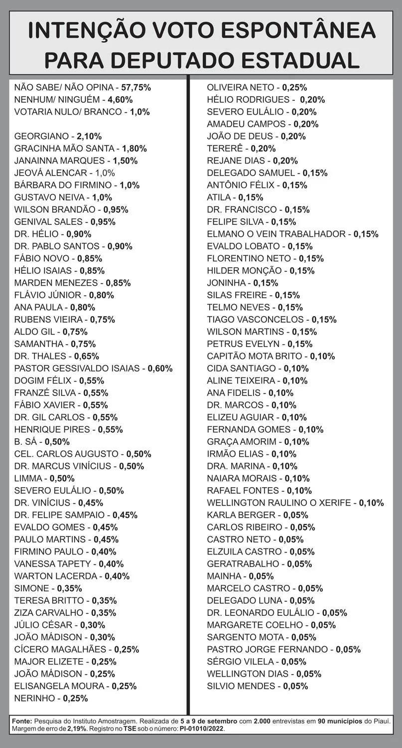 O levantamento foi realizado de 05 a 09 de setembro com 2 mil eleitores em 90 municípios. A amostra tem nível de confiança de 95% e permite margem de erro de até 2,19%. O registro é PI-01010/2022.