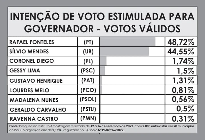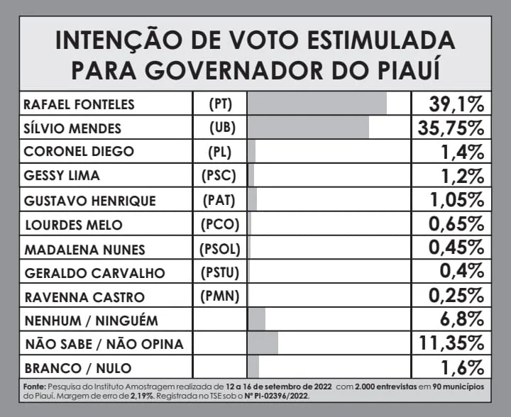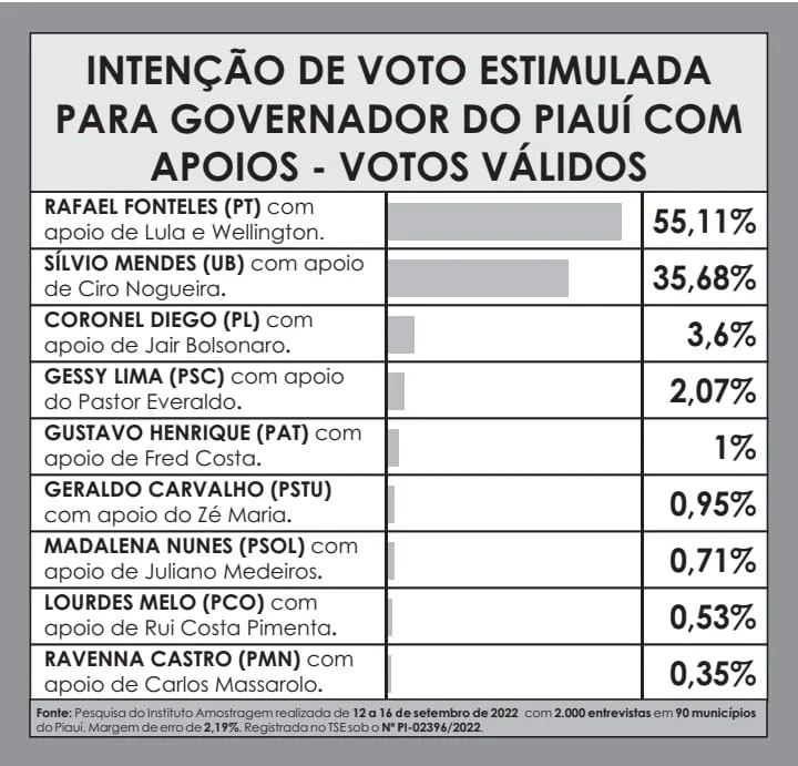 A Pesquisa Amostragem foi realizada no período de 12 a 16 de setembro de 2022 com 2.000 entrevistas em 90 municípios do Piauí. A margem de erro é de 2,19%. O registro para o cargo de governador está sob o Nº PI-02396/2022.