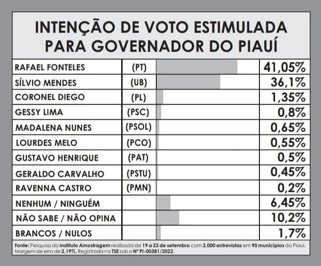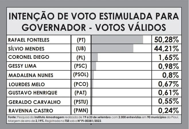 O Instituto Amostragem divulgou nova pesquisa para o Governo do Piauí nesta segunda-feira (26). O candidato Rafael Fonteles (PT) ampliou a vantagem na disputa pelo Palácio de Karnak na pesquisa de intenção de voto estimulada, considerando somente os votos válidos, ou seja, quando se exclui os brancos, nulos e indecisos.