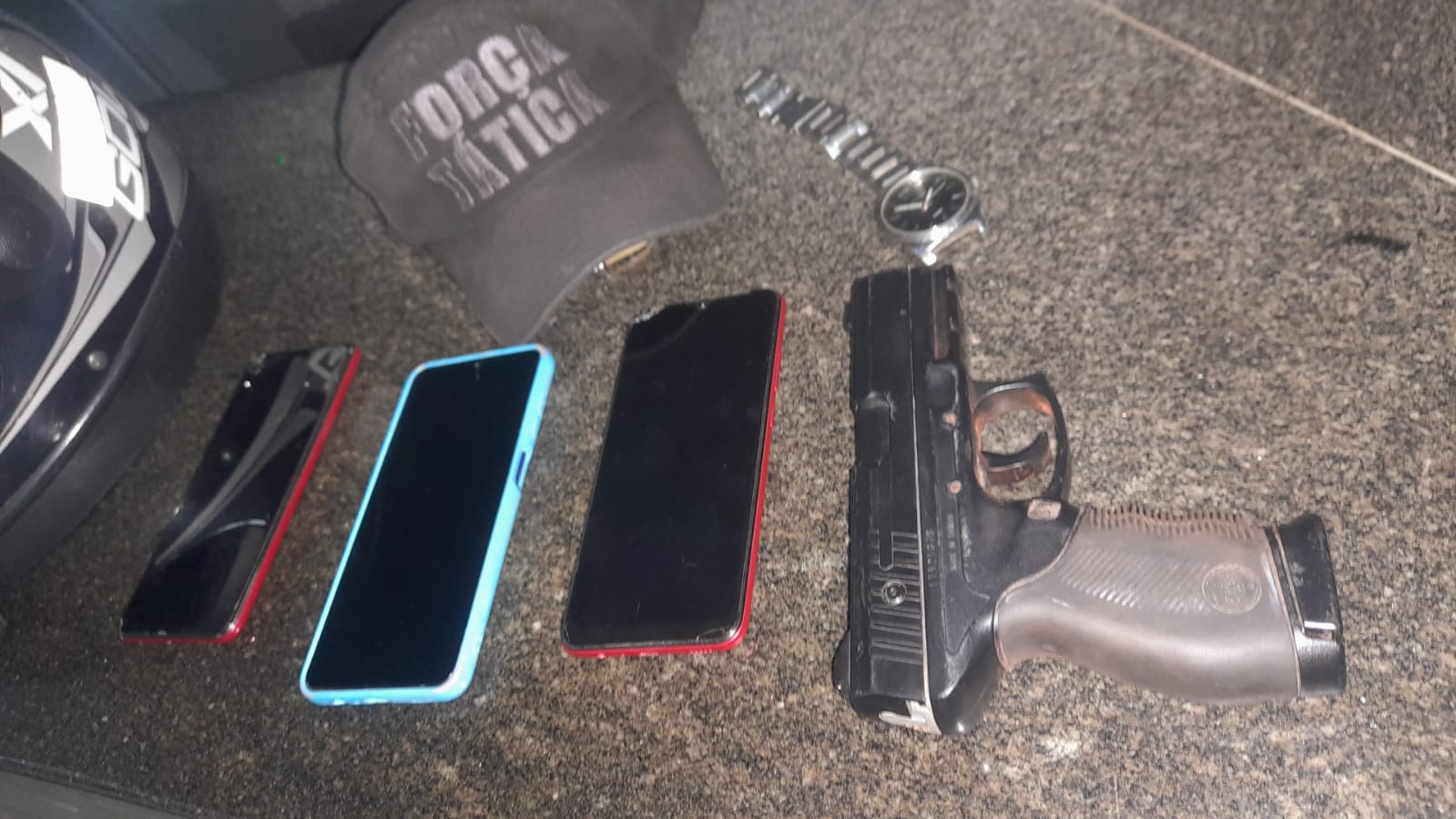 Foi recuperada uma das motocicletas roubadas, a Pop preta, e com eles foram encontrados 3 celulares, todos produtos de roubo. Os dois assaltantes foram presos e autuados em flagrante pelo crime de roubo e ficarão à disposição da justiça.
