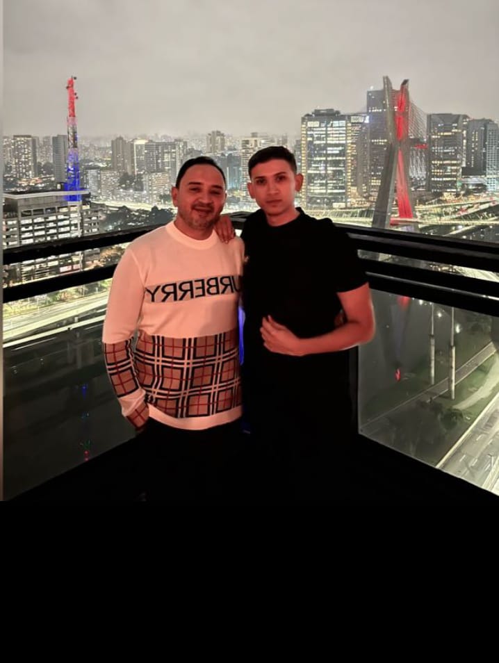 O empresário Michel Soares, proprietário do Restaurante Canto do Sabiá, e seu esposo David Sá em férias no Terraza Rooftopp, em São Paulo.