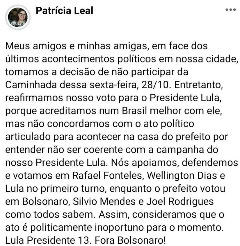 A estratégia foi sentida pela ex-prefeita Patrícia Leal (PT). Ela demostrou insatisfação com o Wellington Dias pelo evento na casa do prefeito. “Não concordamos com o ato político articulado para acontecer na casa do prefeito por entender não ser coerente com a campanha do nosso presidente Lula”, escreveu nas redes sociais.