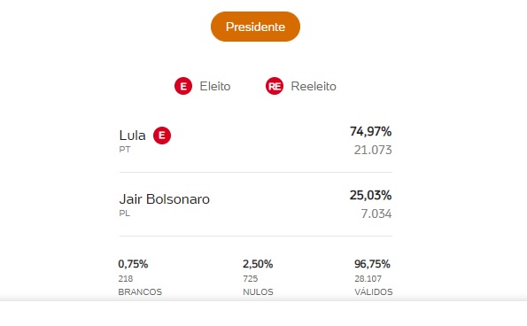 O presidente eleito Luiz Inácio Lula da Silva (PT) obteve 74,97% dos votos nesse domingo (30) no município de Campo Maior. Ao todo, foram 21.073 votos. Já o candidato derrotado Jair Bolsonaro (PL) ficou com 25,03% dos votos, que representa 7.034 votos.