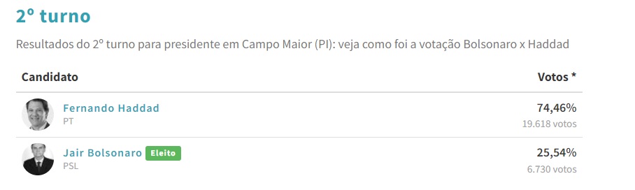 Se comparado os resultados do 2º turno desta eleição com o pleito de 2018, o PT manteve o mesmo percentual de votos em Campo Maior. Com Fernando Haddad foram 74,46% dos votos, contra 25,54% de Bolsonaro.