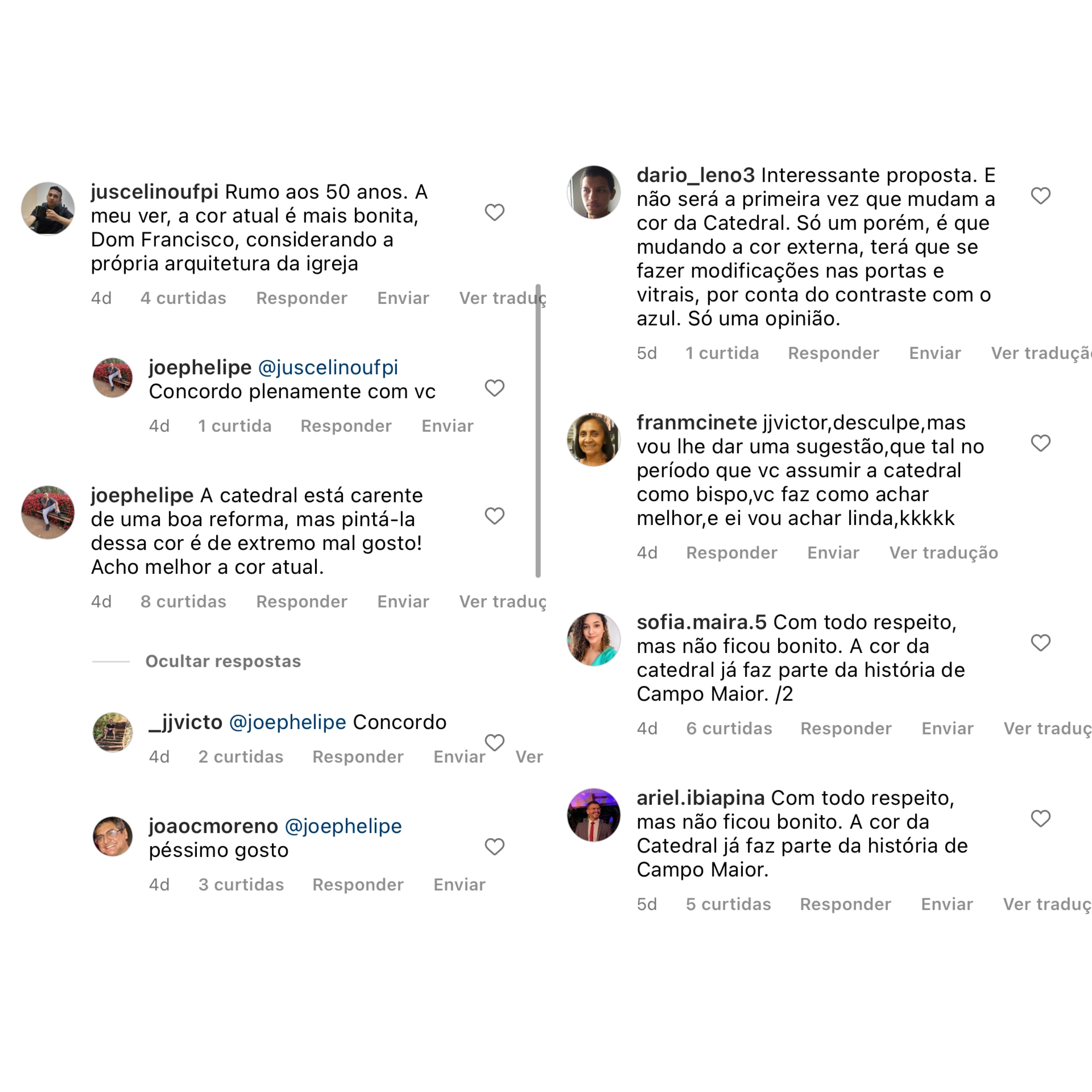 "Acho melhor do jeito que ela está", disse o internauta João Victor. Já Juscelino Sampaio: "Rumo aos 50 anos. A cor atual é mais bonita , Dom Francisco, considerando a própria arquitetura da Igreja". Sofia Maira escreveu: "Com todo respeito, mas não ficou bonito. A cor da Catedral já faz parte da história de Campo Maior".