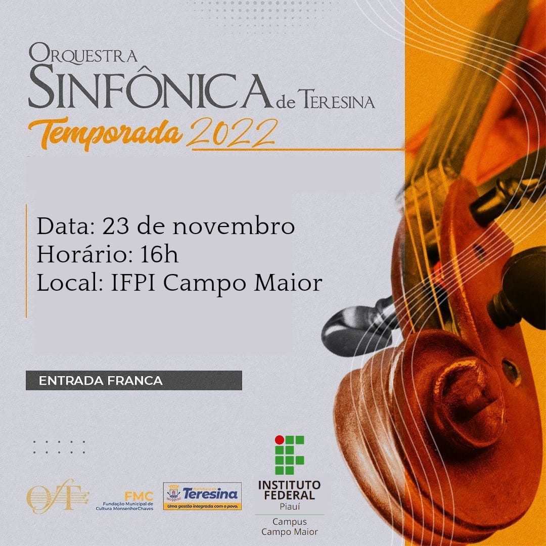 A Orquestra Sinfônica de Teresina tem apresentação agendada neste fim de ano no município de Campo Maior, norte do Piauí. O concerto será realizado no Campus do Instituto Federal do Piauí, no dia 23 de novembro de 2022, às 16h.