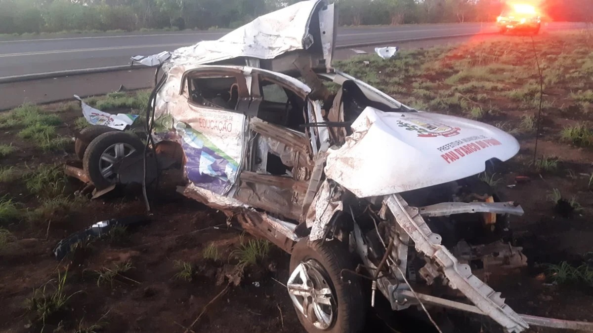 O carro da secretaria ficou completamente destruído e foi parar fora da pista