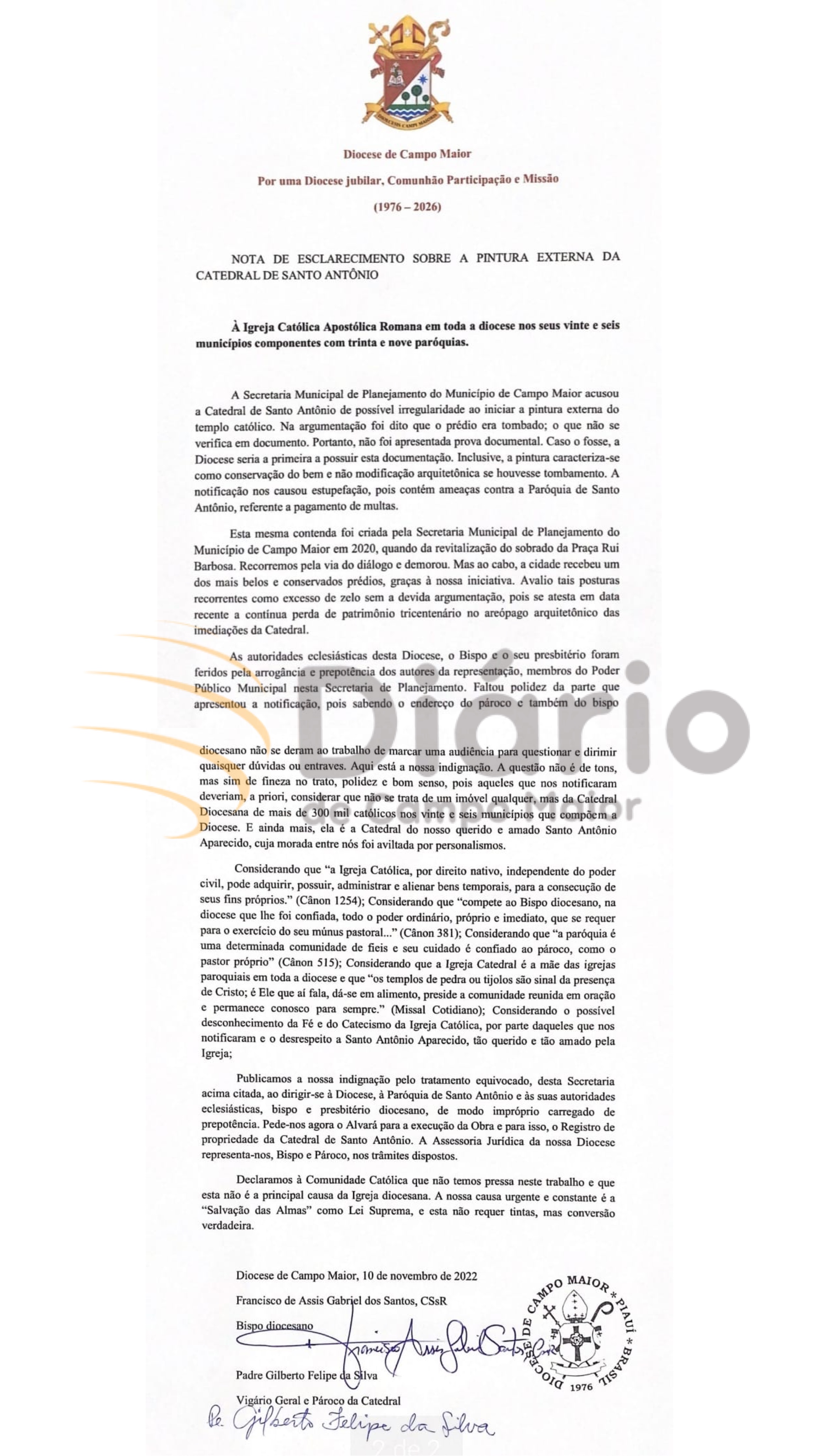 A novela da pintura de tons em dourado na Catedral de Santo Antônio, sede de Diocese de Campo Maior (PI), ganha novos capítulos. Em nota de esclarecimento publicada na noite desta quinta (10), assinada pelo bispo diocesano Dom Francisco de Assis, e pelo pároco, Padre Gilberto Felipe, a Igreja Particular afirma que foi acusada pela Prefeitura de Campo Maior, através da Secretaria Municipal de Planejamento, de estar realizando a pintura do templo de maneira irregular e que foi ameaçada de receber multas.