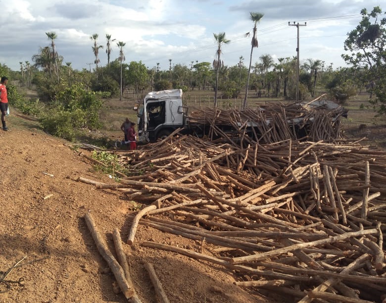 Um caminhão com uma grande carga de madeira tombou na tarde desta terça-feira (27/12) na PI 114, que liga Campo Maior a Cabeceiras do Piauí, na altura da curva do Riacho dos Canudos.
